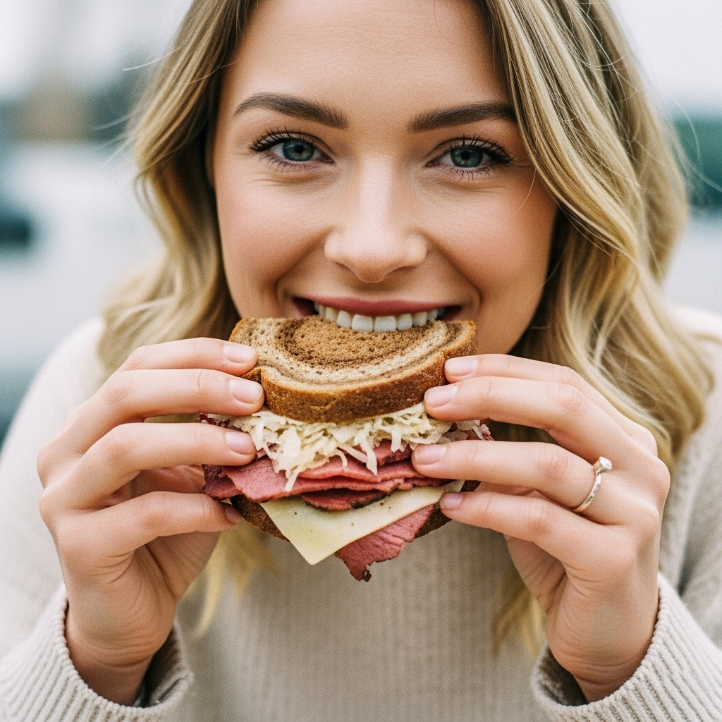 A Reuben sandwich is a grilled sandwich made with corned beef, Swiss cheese, sauerkraut, and Russian or Thousand Island dressing, served on rye bread. It's known for its savory and tangy flavors. Popular in the United States, it's often enjoyed as a hearty lunch option.