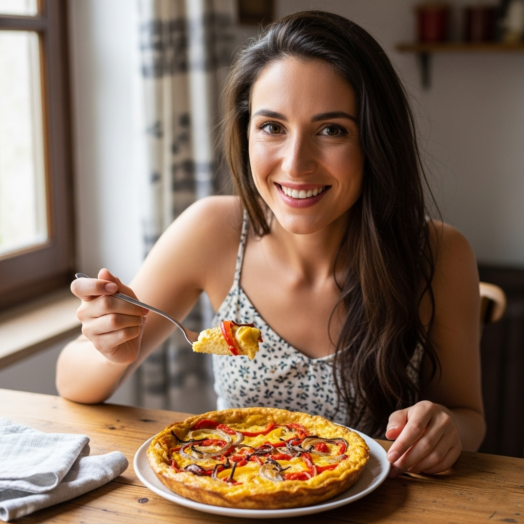 Frittata di Peperoni e Cipolle is an Italian omelette made with eggs, bell peppers, and onions. It's cooked on the stove until firm and can be served hot or cold. This dish is versatile and can be enjoyed as a breakfast, lunch, or dinner. It's flavorful and easy to prepare.