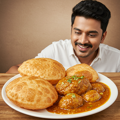 Chola Bhature is a sumptuous North Indian dish, combining spicy chickpeas with deep-fried bread. The chickpeas, richly spiced with a medley of aromatic herbs and spices, provide a hearty, savory experience. The bhature, fluffy and golden, complements the robust flavors, offering a delightful balance of textures and tastes.