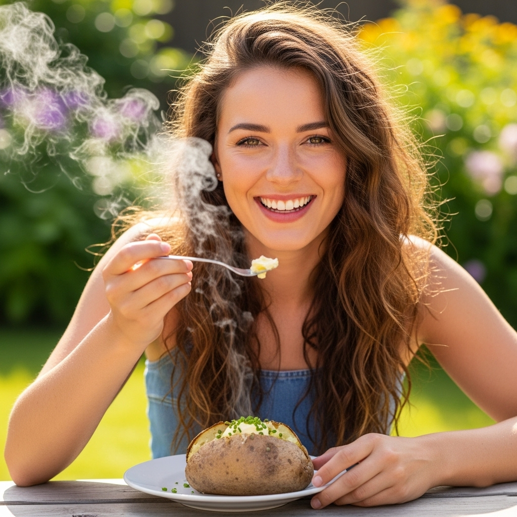 A baked potato is a whole potato cooked in an oven until the inside is soft and the skin is crispy. It is often split open and topped with ingredients like butter, cheese, sour cream, or chives. It's a popular side dish or meal, enjoyed for its simplicity and taste.