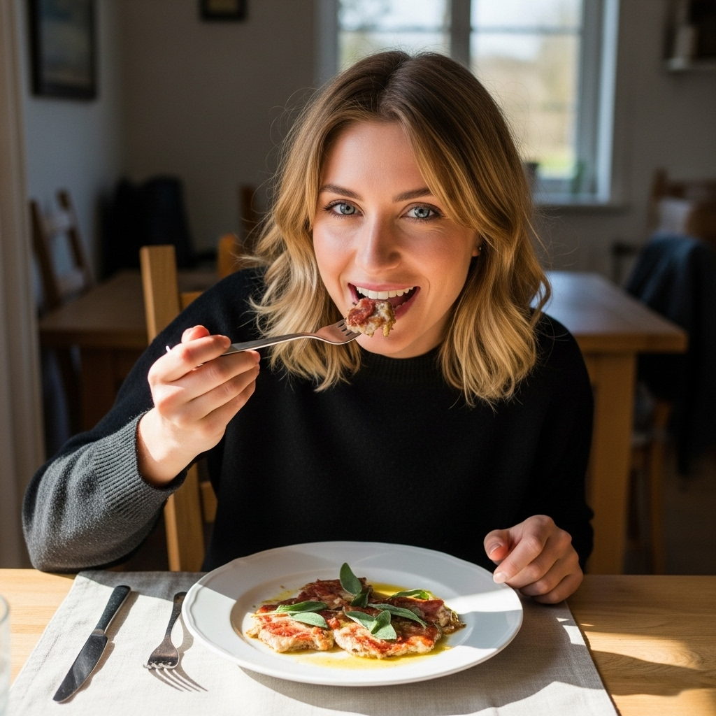 Saltimbocca alla Romana is an Italian dish made with thin veal slices, topped with prosciutto and sage. It's cooked in butter and white wine until tender. This classic dish offers a savory and aromatic flavor, often served with a side of vegetables or salad in Italian cuisine.