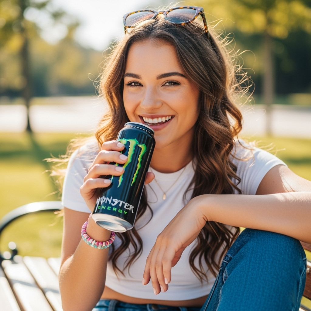 Monster Energy is a popular energy drink known for its high caffeine content. It comes in a black can with a green "M" logo. The drink provides a quick energy boost and is available in various flavors. It's often consumed by people needing extra energy for work or sports.