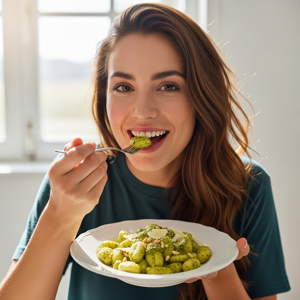 Gnocchi al Pesto is an Italian dish featuring soft, small potato dumplings called gnocchi, coated in a vibrant green pesto sauce. The pesto is made from fresh basil, garlic, pine nuts, Parmesan cheese, and olive oil. This dish offers a rich, savory flavor and is often garnished with extra cheese.