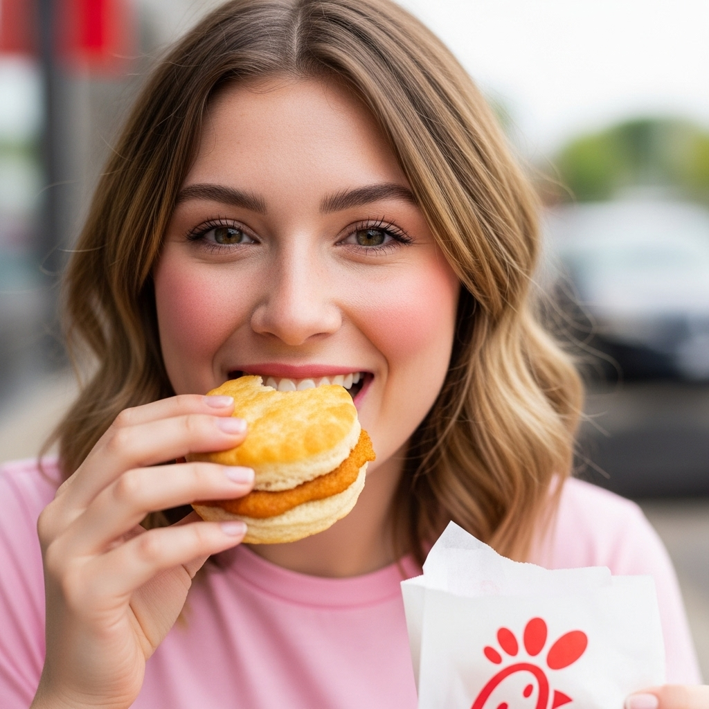 The Chick-fil-A Chicken Biscuit features a tender, seasoned chicken breast, hand-breaded and pressure-cooked, served inside a warm, buttery biscuit. It's a popular breakfast item, offering a savory and satisfying combination perfect for a morning meal. This item is known for its flavorful taste and quality ingredients.