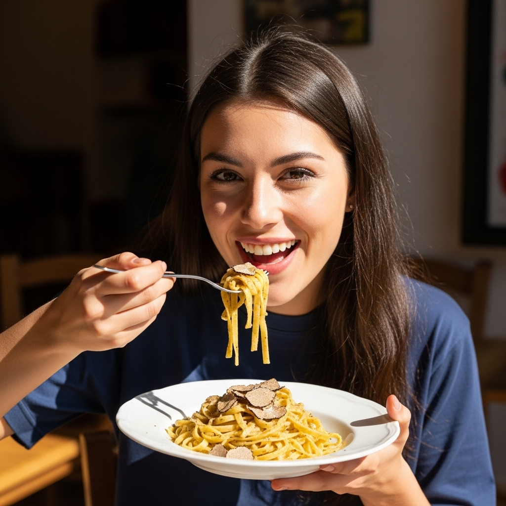 Tagliatelle al Tartufo is an Italian pasta dish made with flat, ribbon-like noodles called tagliatelle, tossed in a creamy sauce flavored with truffles. Truffles are rare, aromatic fungi that add a rich, earthy taste. This elegant dish is often garnished with Parmesan cheese for extra flavor.
