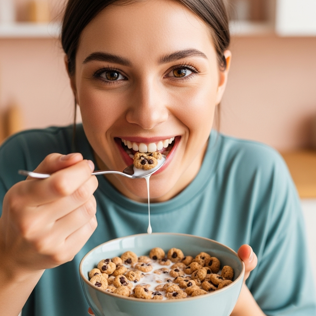 Cookie Crisp is a breakfast cereal that looks like small chocolate chip cookies. Made by General Mills, it's sweet and crunchy, often enjoyed with milk. The cereal is popular for its cookie taste but is intended for breakfast. It contains sugar, grains, and chocolate flavoring.