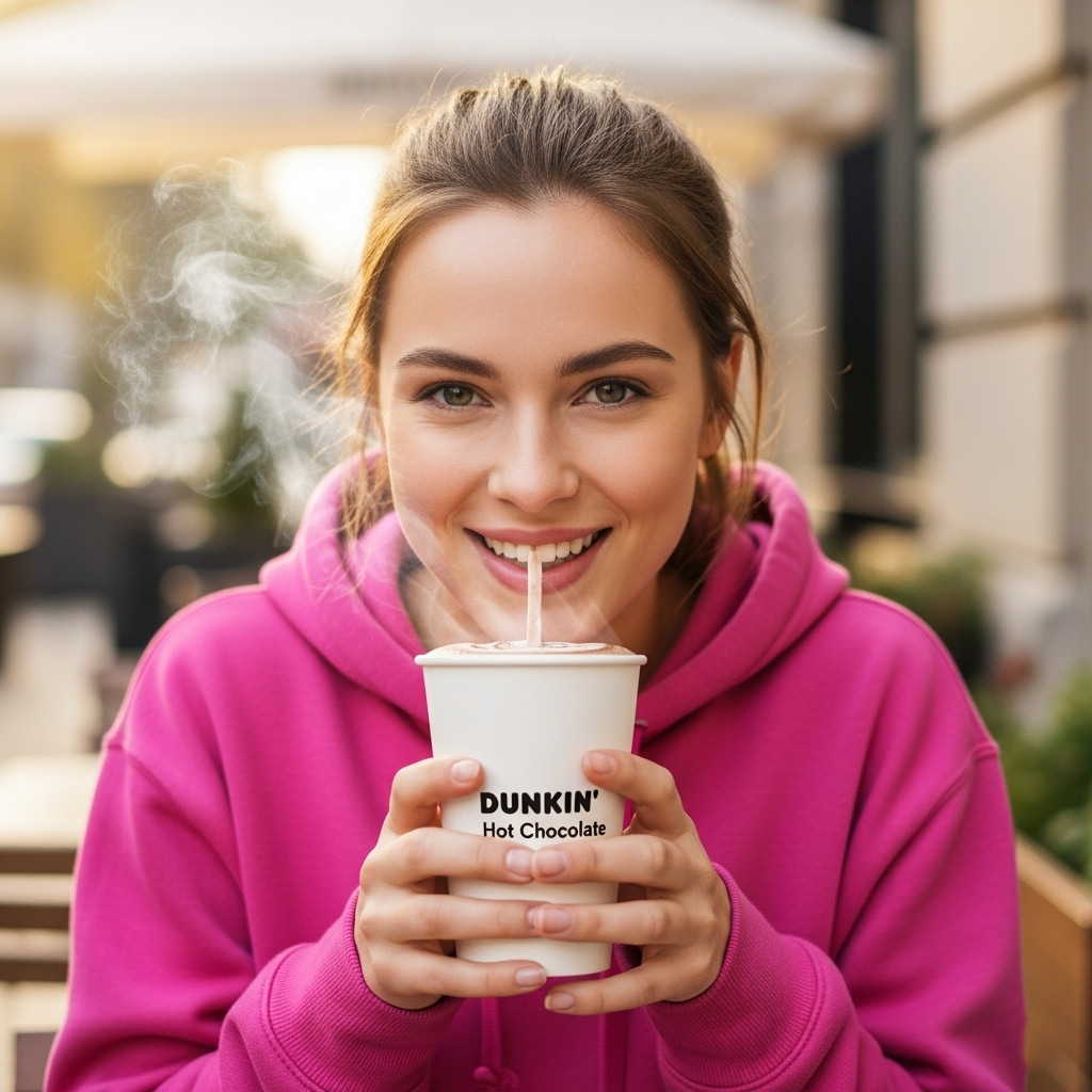 Dunkin' Hot Chocolate is a warm, sweet drink made with rich chocolate flavor. It's served in a cup and is perfect for a cozy treat. This beverage is creamy and can be topped with whipped cream. It's a popular choice, especially during cold weather.