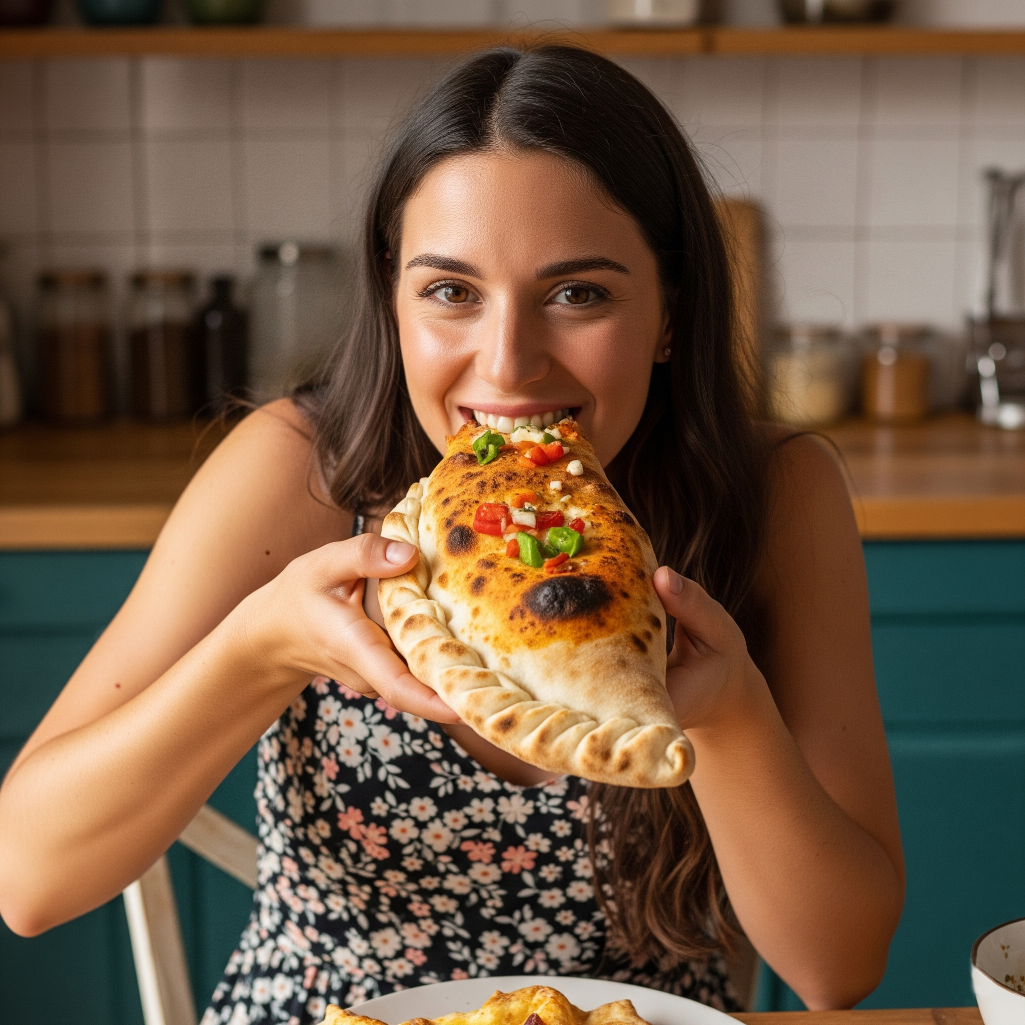 A calzone is a folded Italian pizza, shaped like a half-moon. It is made from pizza dough filled with ingredients like cheese, meats, and vegetables. After folding, it is baked until golden brown. Calzones are often served with a side of marinara sauce for dipping.