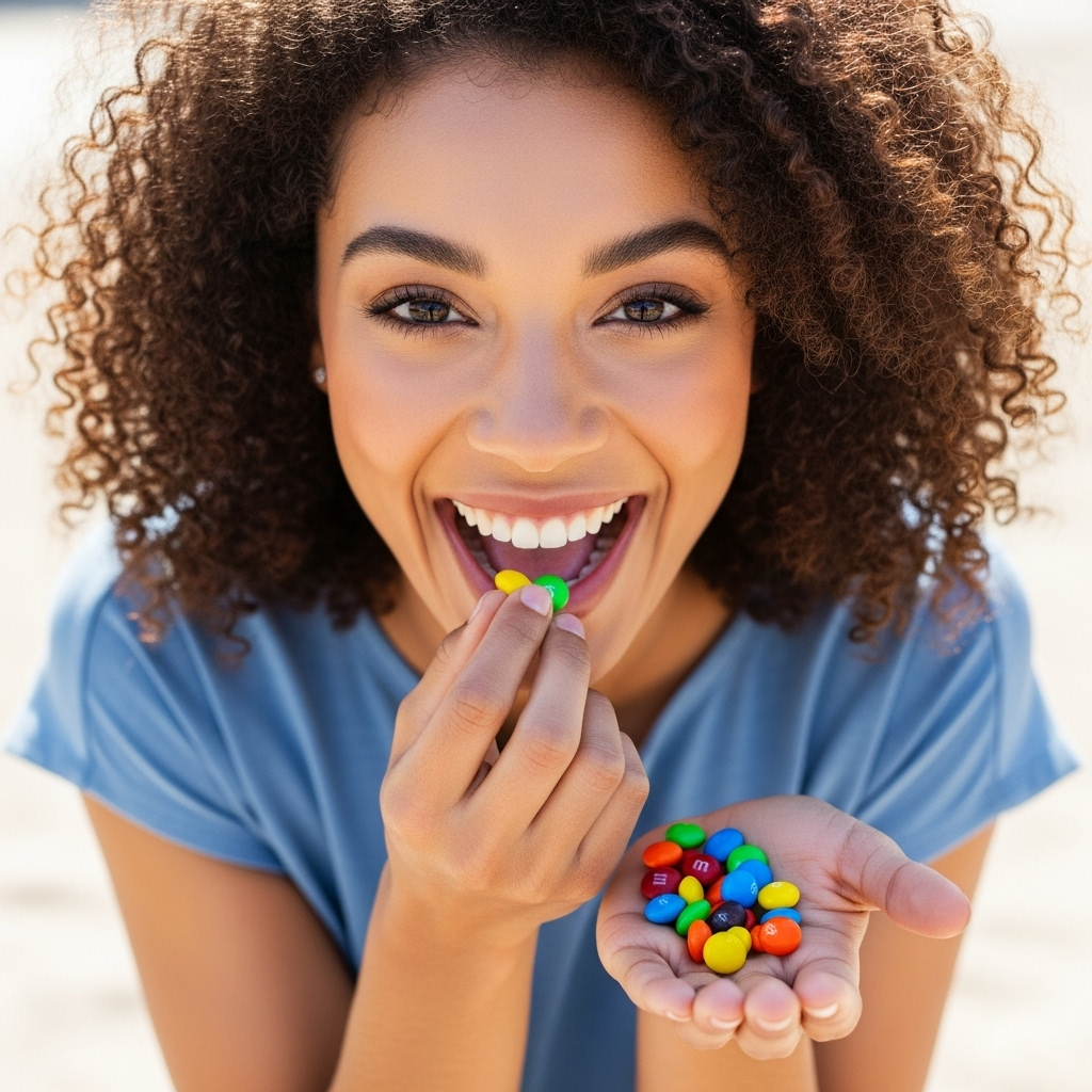 M&M's are small, colorful chocolate candies with a hard sugar shell. Each candy has a letter "M" printed on it. They come in various colors and are popular worldwide. M&M's are often used in snacks, desserts, and baking, and are available in different flavors like peanut and almond.